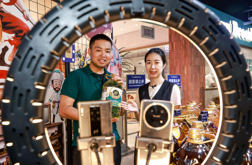 6月17日,主播在山东省青岛市李沧区深广互动直播基地内介绍家电产品“国补”政策。新华社发(张鹰摄)