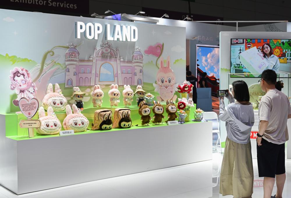 5月24日,在文博会北京展区,观众在泡泡玛特城市乐园展台前拍照。新华社记者 肖恩楠 摄