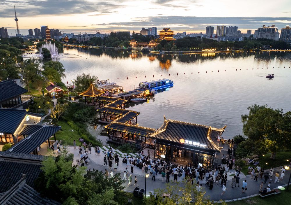 6月28日,人们在泰州市海陵区桃园景区游玩(无人机照片)。 据悉,在江苏省城市足球联赛泰州队主场比赛期间,联赛各场次比赛购票观众和客场球队城市市民,均可享受泰州48家旅游景区免费入园、免费品尝泰州早茶,以及停车、住宿、购物等多项优惠。新华社发(汤德宏 摄) 南京、苏州等地开设“球迷专列”,方便球迷出行;多地将单一的免景区门票扩展到旅游、餐饮、住宿、演艺领域。据了解,通过推出“苏超观赛+文化体验”套票,游客人均消费增长近3倍。 去哪儿旅行数据显示,在“苏超”第4轮比赛中,6个主场城市的酒店预订量同比大幅增长。其中,淮安酒店预订量较去年同期增长1.5倍,宿迁增长67%。“苏超”正在变成整个江苏的推介引流大会。