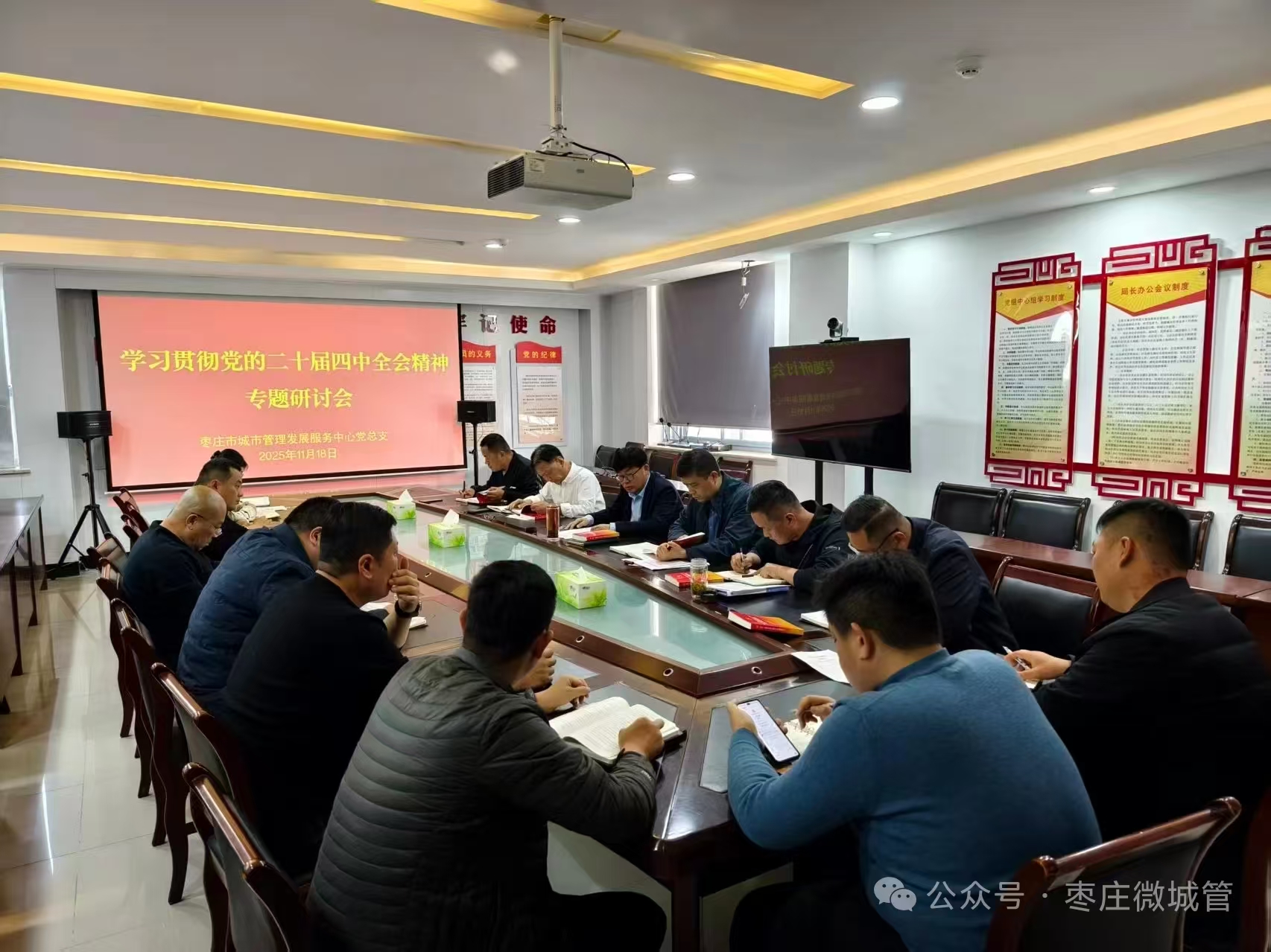 11月18日下午,市城市管理发展服务中心党总支召开党的二十届四中全会精神专题学习研讨会,围绕“精管善治 城美人和”主题,深入学习领会党的二十届四中全会精神。会议紧密结合中央、省、市城市工作会议部署,旨在将全会精神转化为推动枣庄城市管理现代化的具体实践。 会议由中心党总支书记、主任张超主持,全体党员干部参加学习研讨。通过书记领学、集体研讨,大家形成共识:学习贯彻全会精神,关键在于将其转化为提升城市精细化管理水平、增进民生福祉的实际行动,让市民群众在城市生活中感受到实实在在的变化。 张超书记结合学习研讨和城市管理工作实际,提出三项具体要求:一是深刻把握全会精神实质,将学习成果转化为城市治理现代化的生动实践。城市管理水平直接关系人民群众的获得感、幸福感、安全感。必须提高政治站位,从推进中国式现代化的高度来谋划和推动城市管理工作。二是聚焦“精管善治”,以重点突破带动城市管理服务品质整体提升。围绕“城市管理服务品质提升”重点工作,在基础设施韧性上攻坚发力、在深化精细管理上拓展空间、在智慧赋能增效上深化改革,实现从“整洁有序”到“精致精美”的蝶变。三是强化担当作为,以全面从严治党和过硬作风保障任务落实。坚持党建引领,将党建品牌创建深度嵌入城市治理全过程。持续巩固深化作风建设,树立重实干、重实绩、重担当的鲜明导向。开展常态化政治理论学习和忠诚教育,推行“干部大讲堂”、业务比武、案例研讨,全面提升队伍解决复杂城市管理问题的专业能力,建设一支政治强、业务精、纪律严、作风硬的城管铁军。 会议结束前,张超总结强调:“我们要以二十届四中全会精神为指引,把‘精管善治 城美人和’的理念融入日常工作中,让枣庄的城市管理更好地服务于‘十五五’时期经济社会发展大局。”