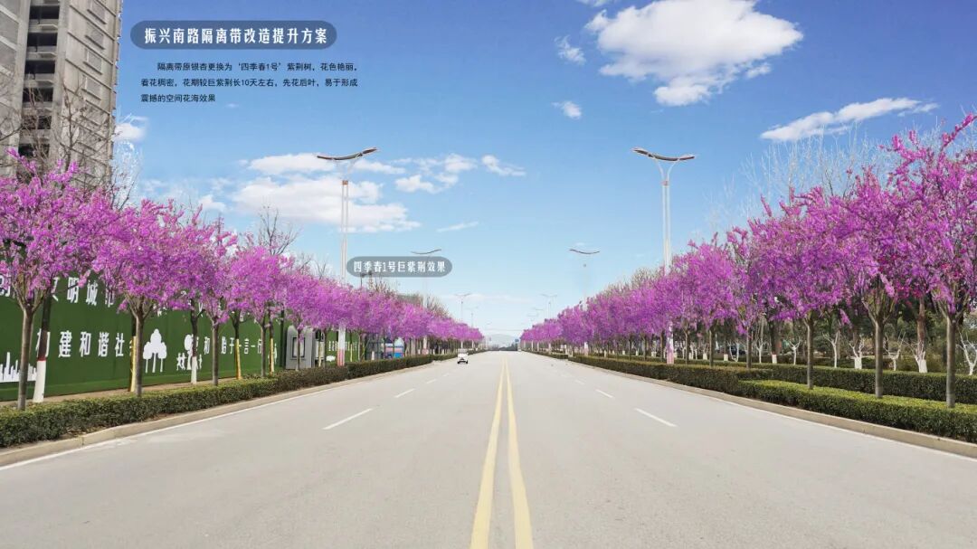 (振兴南路效果图) 在振兴南路施工现场,园林工作人员按照施工计划有序进行搬运、种植等工作,多组工人和施工车辆配合作业,对道路两侧老化行道树进行更新。